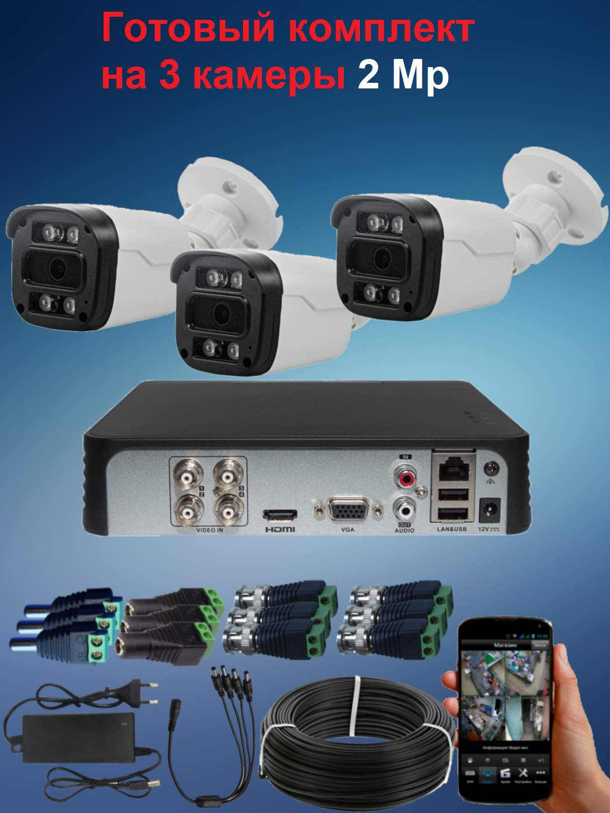 Готовый комплект уличного видеонаблюдения для самостоятельной установки на 3 камеры высокого разрешения 2 Мп, 1920х1080;