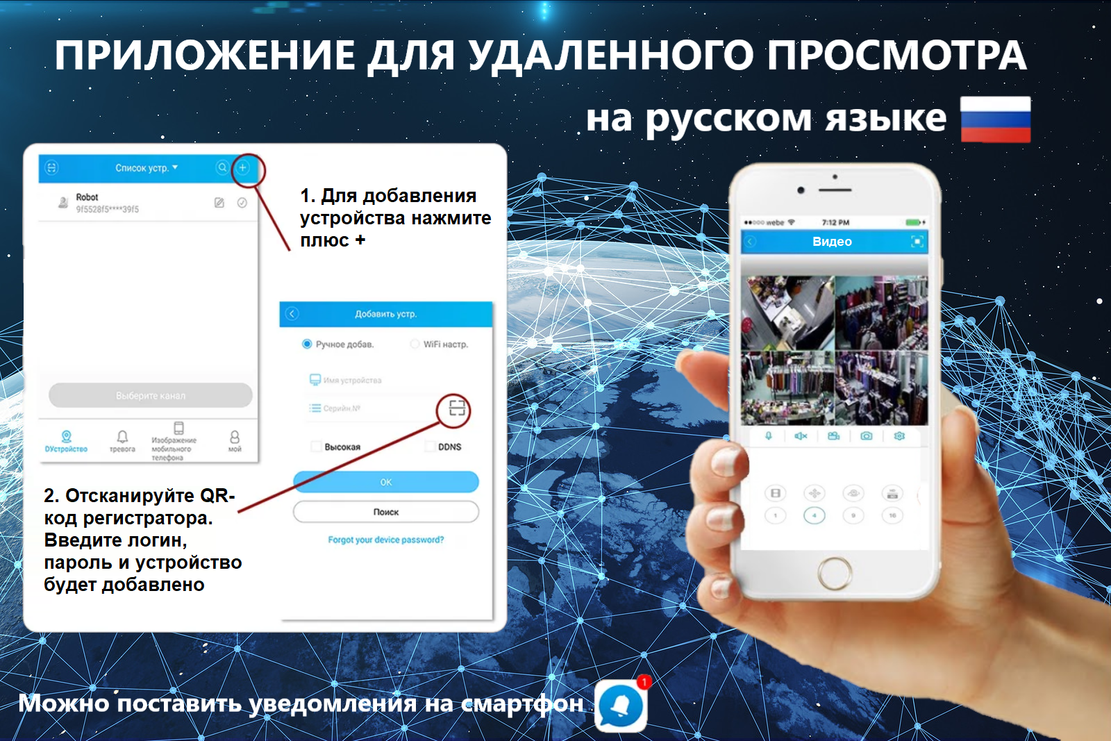На 4 камеры 2 Мп, с возможностью просмотра онлайн и архива на телефоне(Android, Iphone)