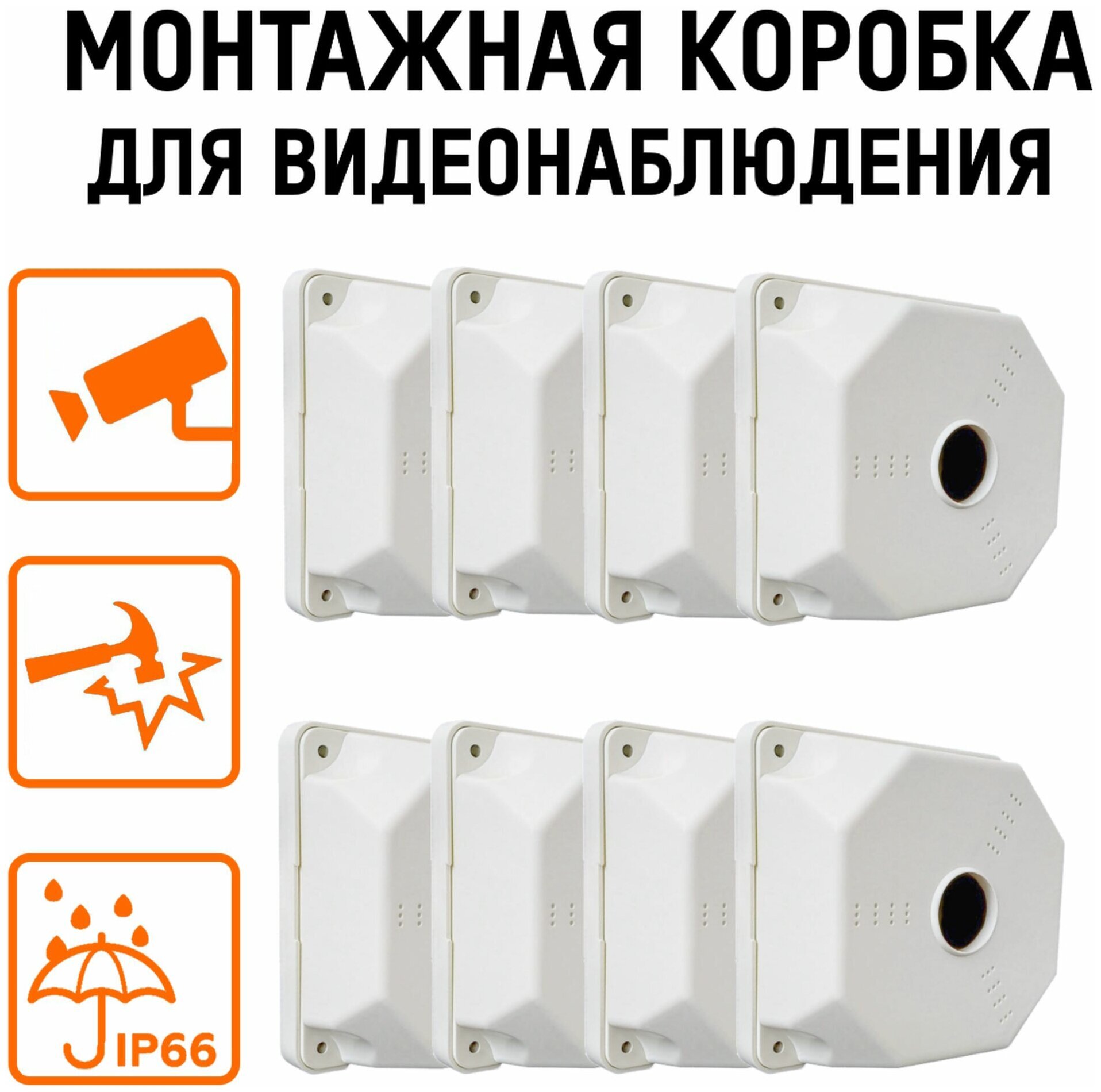Отверстие диаметром 35мм для подключения разъёмов. Внутреннее пространство позволяет разместить блок питания и устройства коммутации, защищая их при этом от атмосферных осадков. Монтажная коробка обеспечивает идеальную гальваническую развязку корпуса видеокамеры от устанавливаемой поверхности (критично при установке на металлические конструкции). Материал изготовления - ударостойкий пластик, устойчивый к перепадам температур и ультрафиолету. Материал корпуса пластичный, при вкручивании саморезов не трескается, в обработке очень удобен. Выдерживает большие нагрузки.
