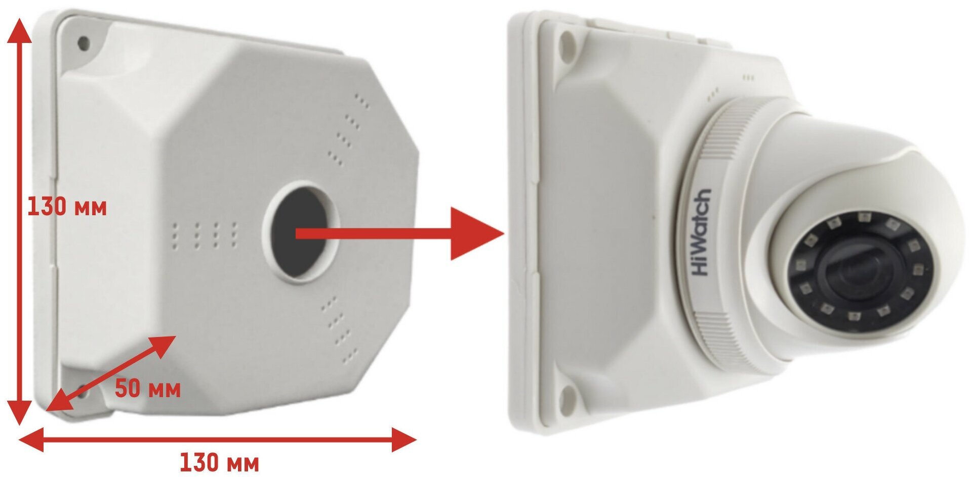 Накладной способ монтажа. Степень защиты: IP-66. Материал: водонепроницаемый ударопрочный пластик. Размеры: 130х130х50мм.