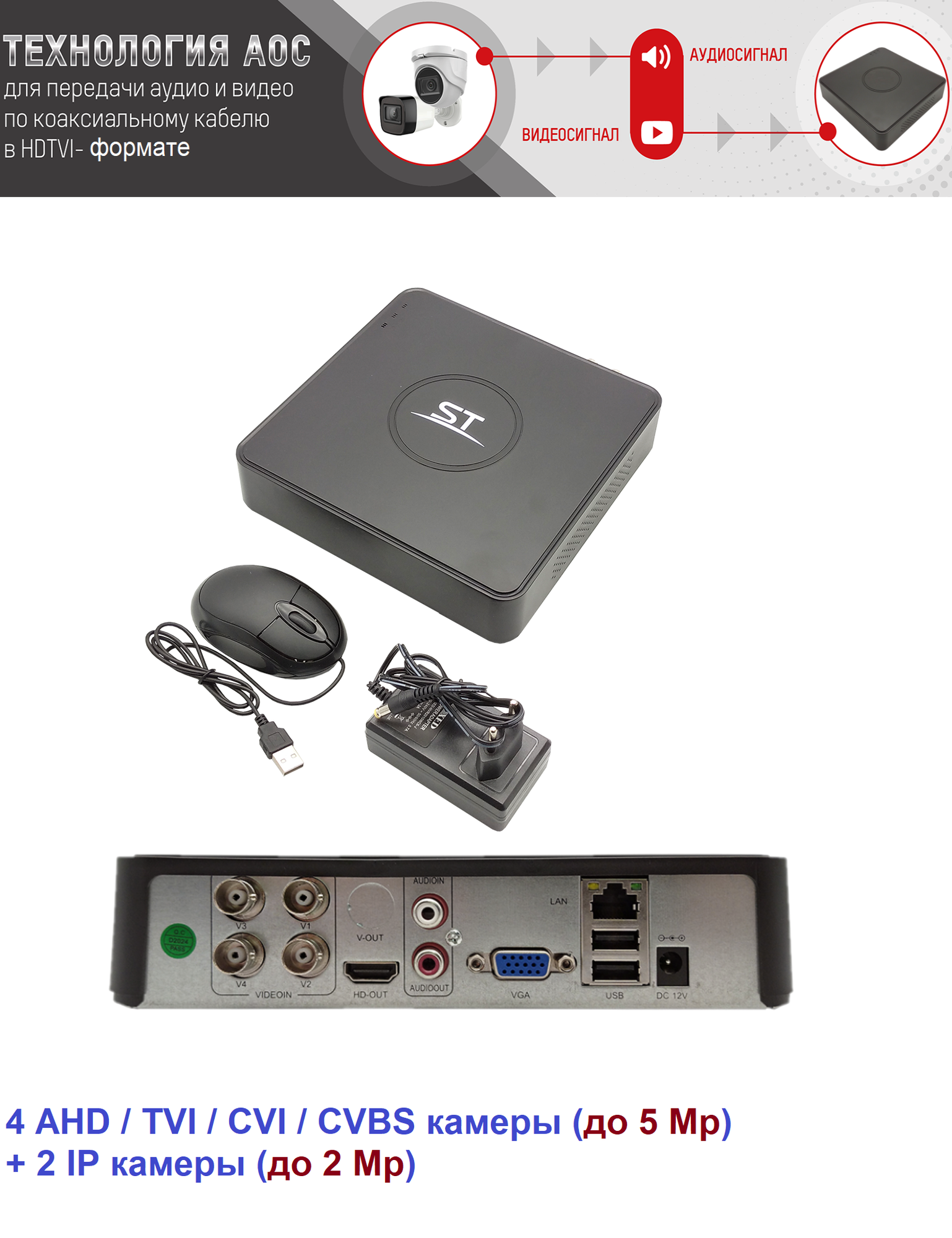 - Гибридный режим работы (HVR) - 4 камер 5M-N AHD/TVI/CVI/XVI + 2 IP-камеры 1080P